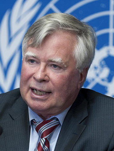 Philippe Kirsch (left) speaks with Navy Pillay, United Nations, High Commissioner for Human Rights, at the 19 th Session of the United Nations Human Rights Council in 2012. Jean-Marc Ferré / United Nations.